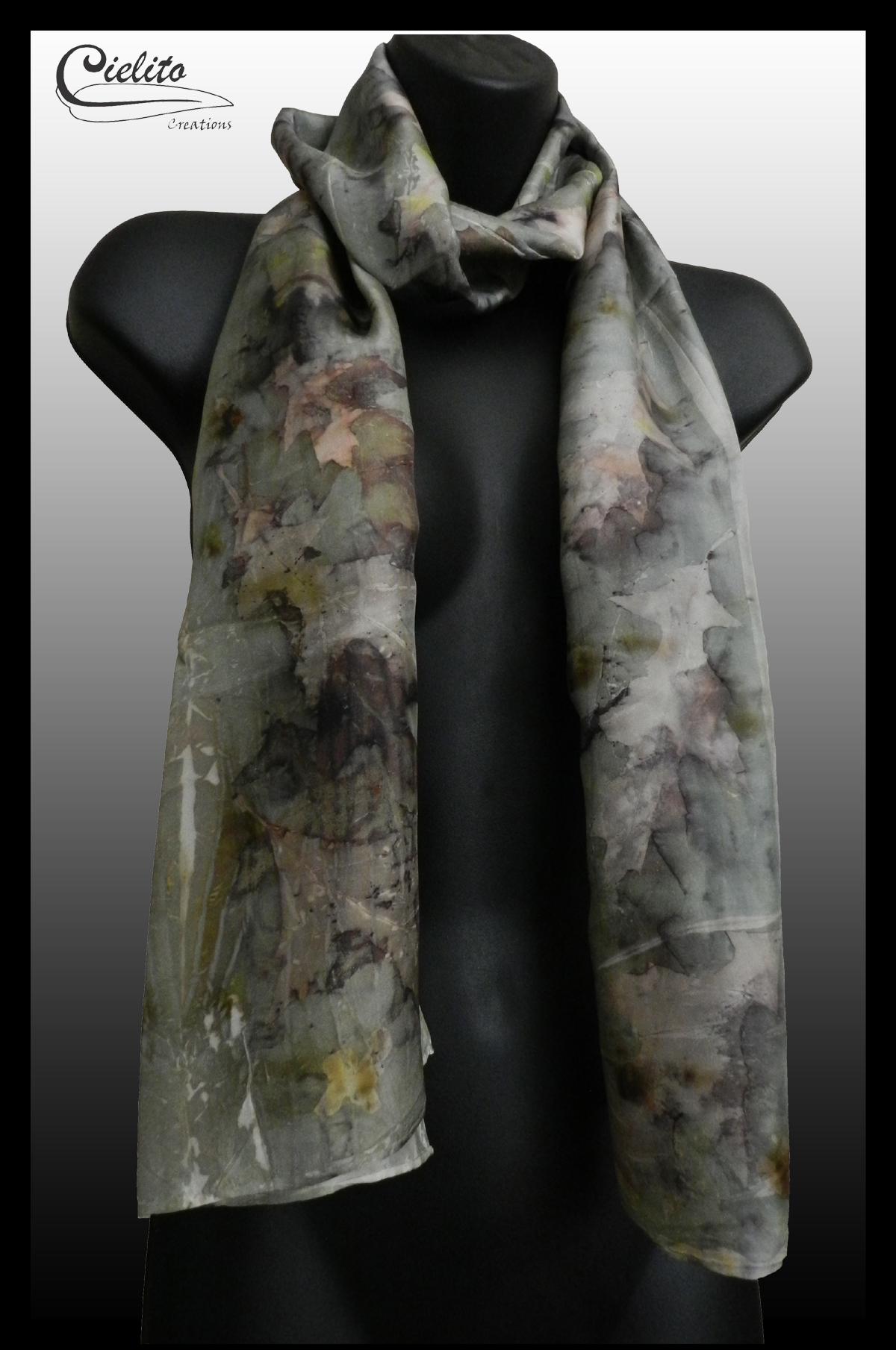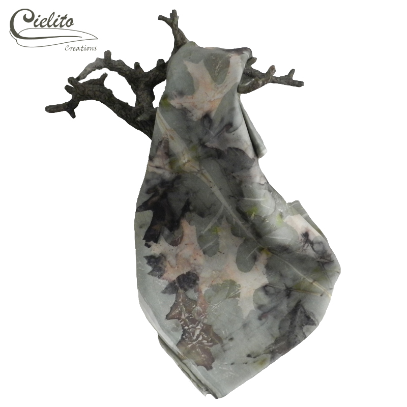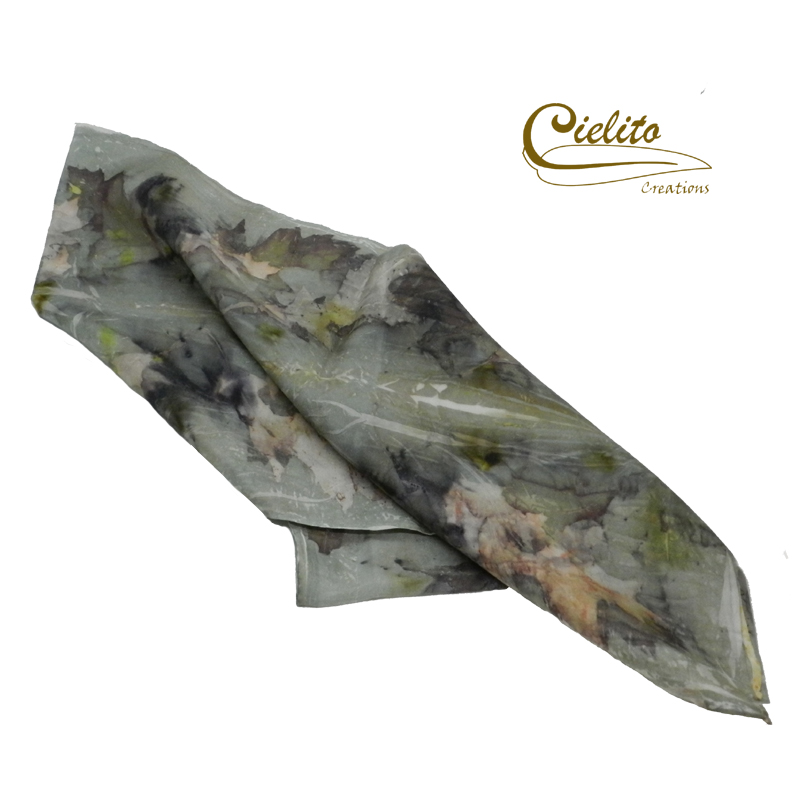You will get noticed with this gorgeous natural eco-printed dyed silk scarf. This has been hand dyed by the designer Cielo Quintero.
