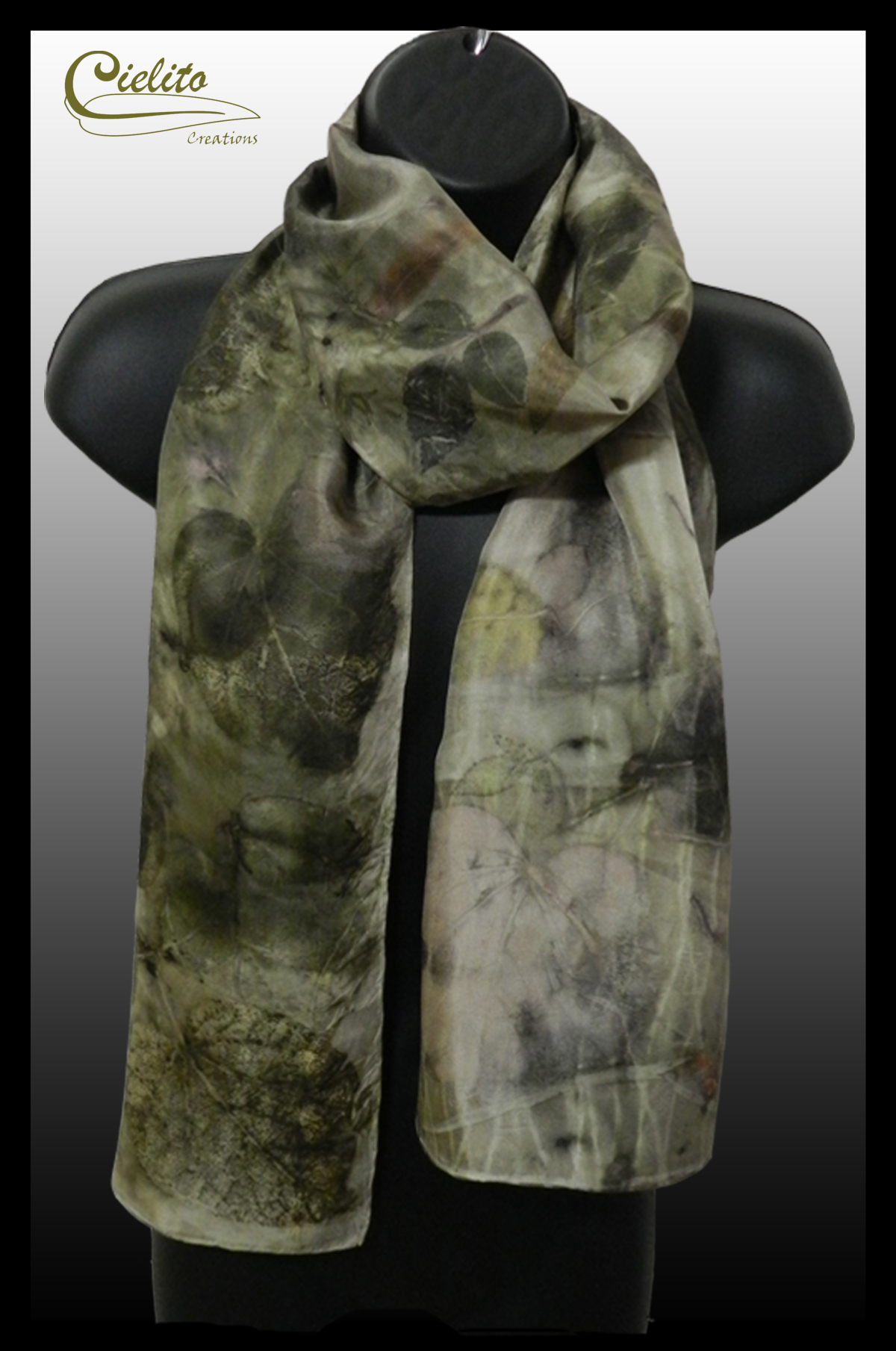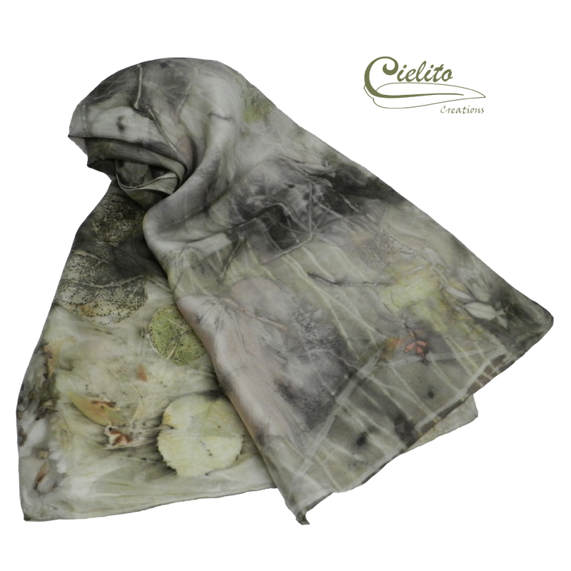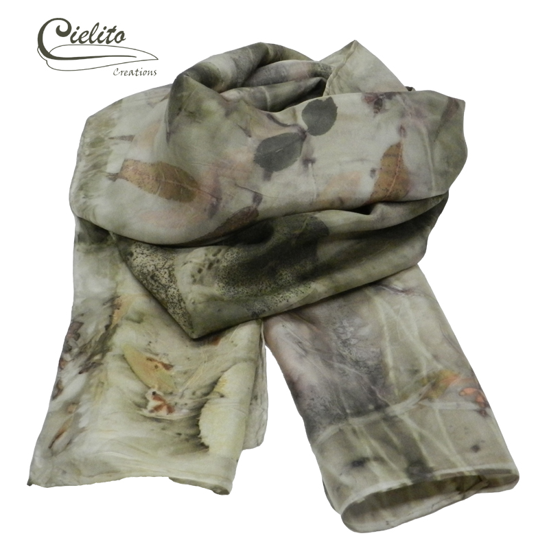 You will get noticed with this gorgeous natural eco-printed dyed silk scarf. This has been hand dyed by the designer Cielo Quintero.